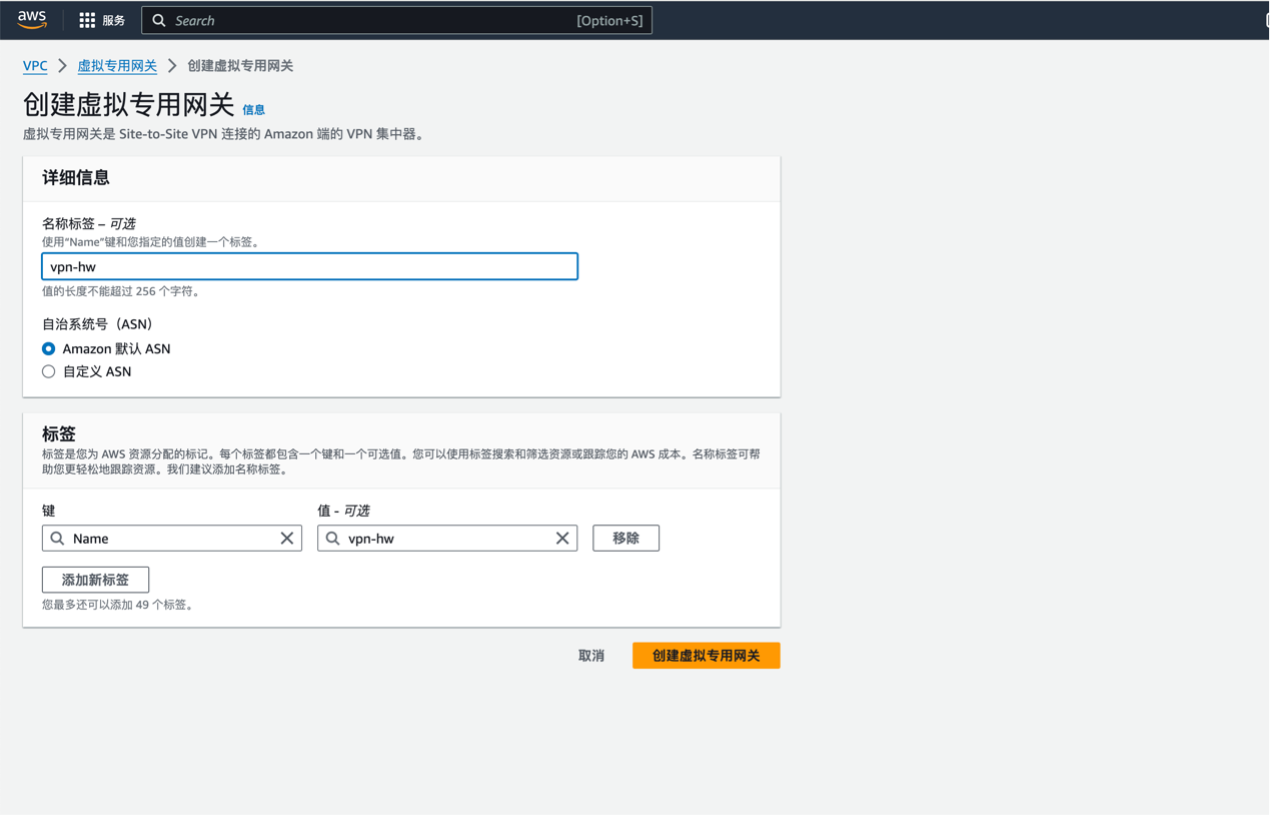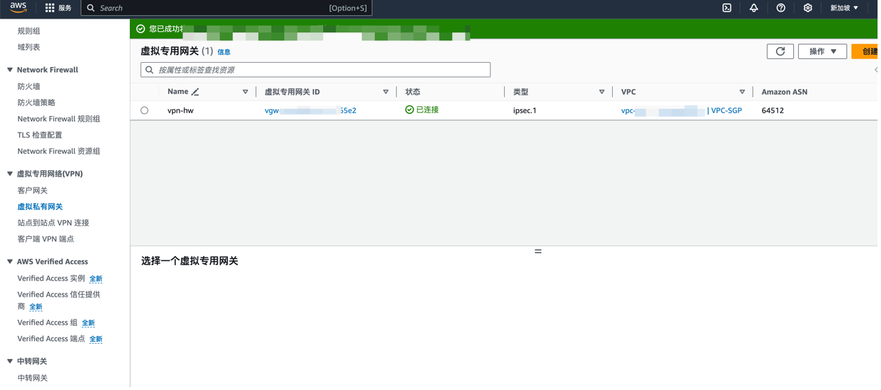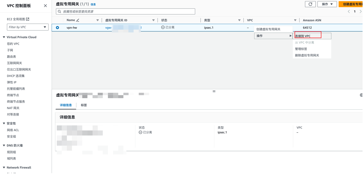 虚拟专用网关创建后,需要连接到 VPC,选择需要和华为侧连通的 VPC